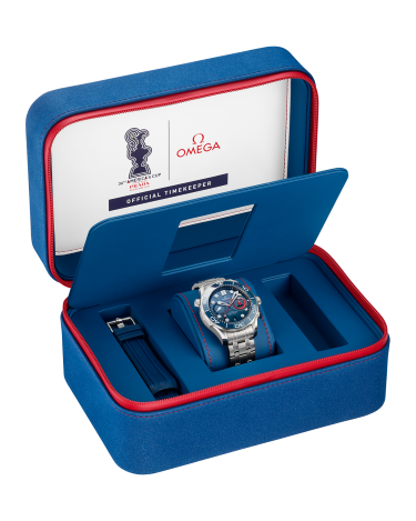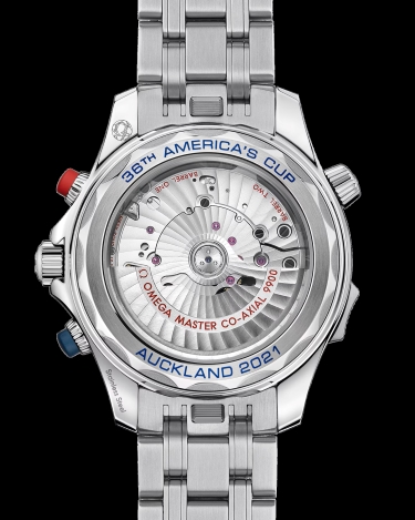 blue lacquer and pay tribute to the “36th America’s Cup” and “Auckland 2021”.The watch is presented on a metal bracelet with an additional rubber strap, both